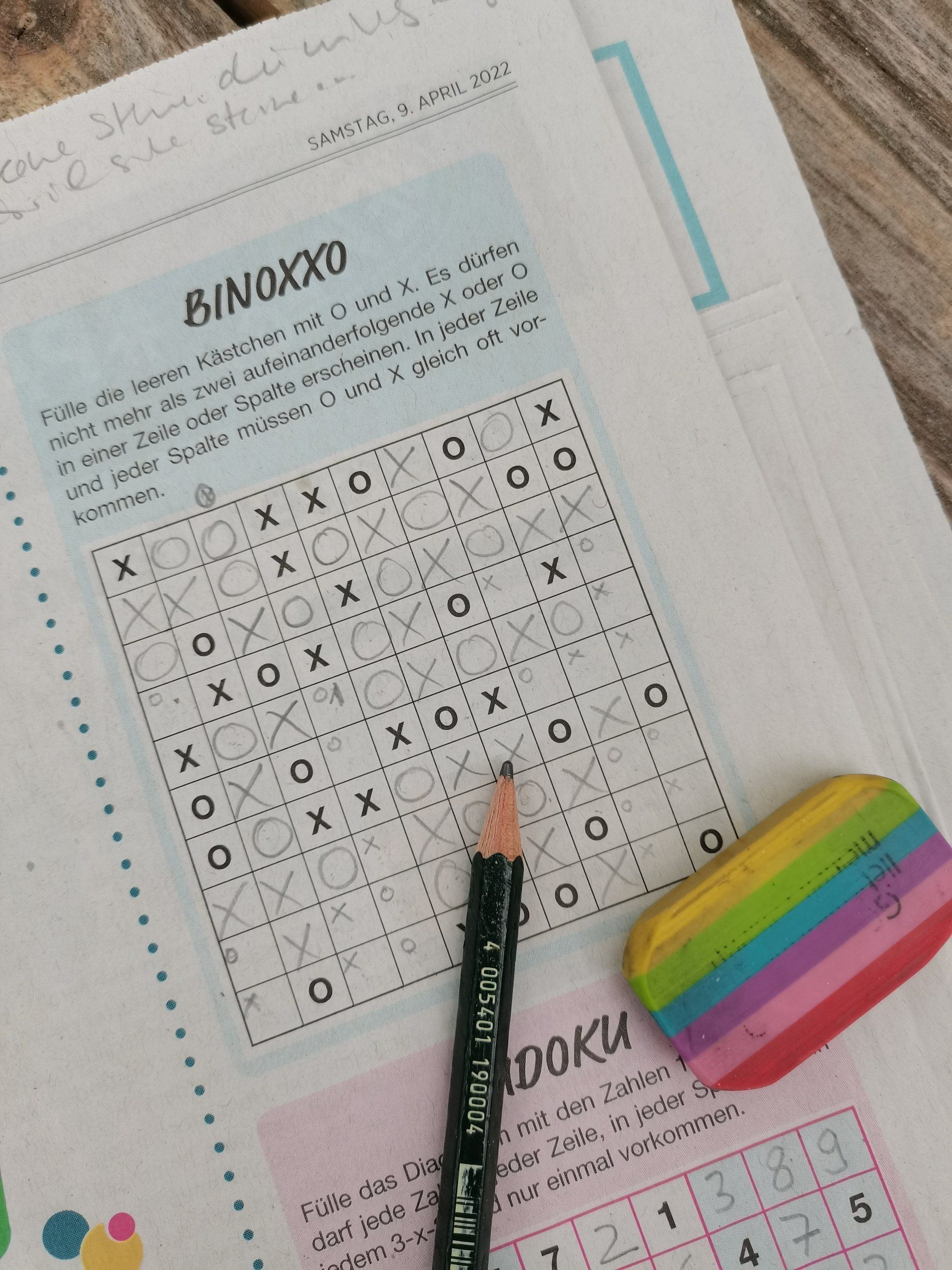 Binoxxo zählt zu meinen Lieblingsrätseln: In jeder Spalte und jeder Zeile haben sich jeweils fünf Kreuze und Kreise einzufinden. Allerdings dürfen nicht mehr als jeweils zwei von ihnen aufeinander folgen. Es kann also knifflig werden. Neulich spielten mein Sohn und ich Binoxxo. Ich hatte eine Kopie vom Rätsel gemacht und nun ging es darum, wer gewinnt. Meist hat mein Sohn die Nase vorn. Aber diesmal war er still und rätselte, so dachte ich, vor sich hin. Ich war auch still – ich hing nämlich fest. Nirgendwo fand sich eine Möglichkeit, ein Kreuz oder einen Kreis zu setzen. „ … schwierig...“, meinte mein Sohn und ich dachte, es ergeht ihm wie mir.